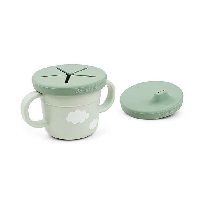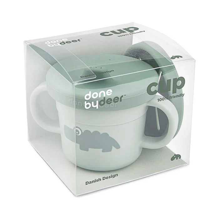Чашка Done by Deer Foodie Croco 3-в-1 — універсальна дитяча чашка для пиття та перекусів. У комплект входять дві змінні кришки: з носиком для пиття та кришка для снеків із м’яким отвором.
