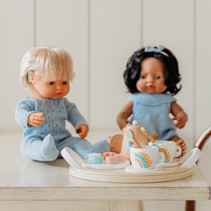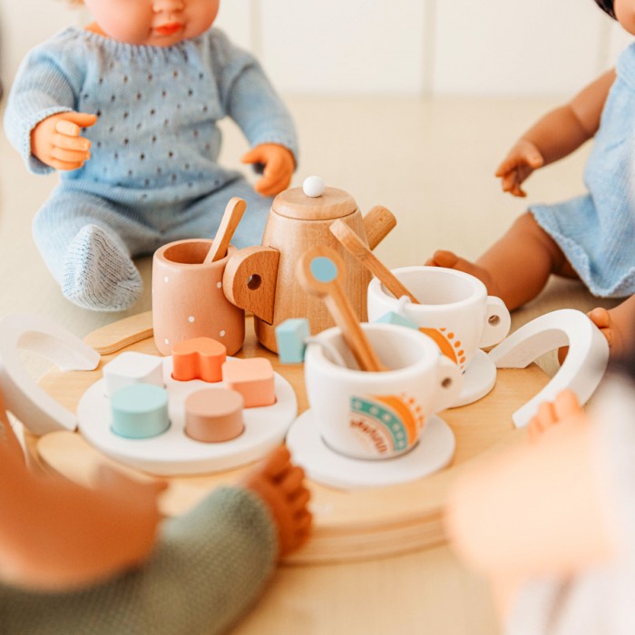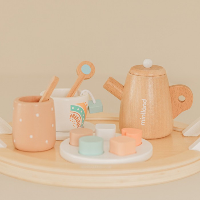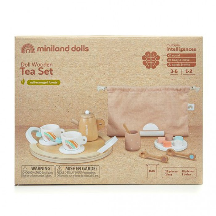 Часто ми спостерігаємо як дітки розсаджують улюблених ляльок та м'які іграшки навколо столу та роблять їм чай? Саме для такої рольової гри компанією Miniland Educational створено ігровий набір "чайний сервіз". У ньому цілих 18 предметів та текстильна сумочка для зберігання.