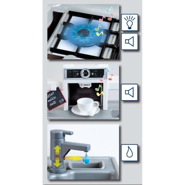 - Має електронні звуки приготування їжі, мерехтливе світло і кран з функцією води.
