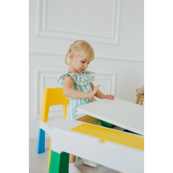 Набір складається з багатофункціонального столика і зручного стільця для дітей від 1 року до 6 років. Трансформується відповідно до зміни потреб та інтересів дітей.