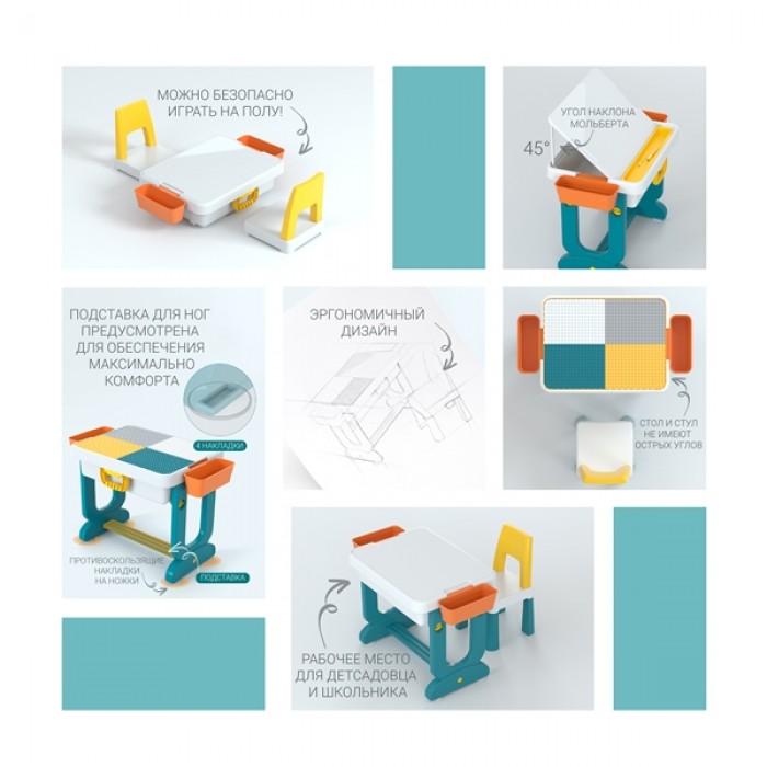 ● Стільниця столу може перетворюватися в мольберт, в ігрову панель для конструктора LEGO, а також їх аналогів, в поверхню для малювання, письма, занять або обіду.