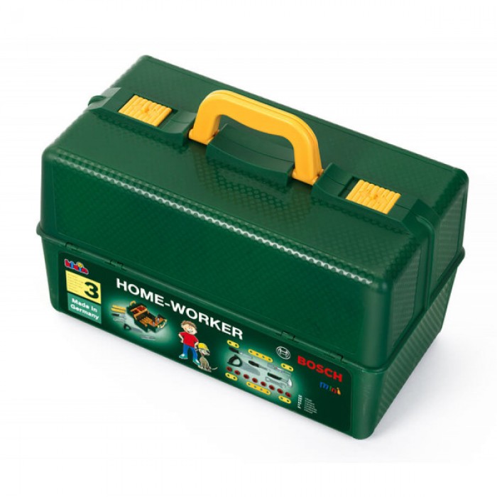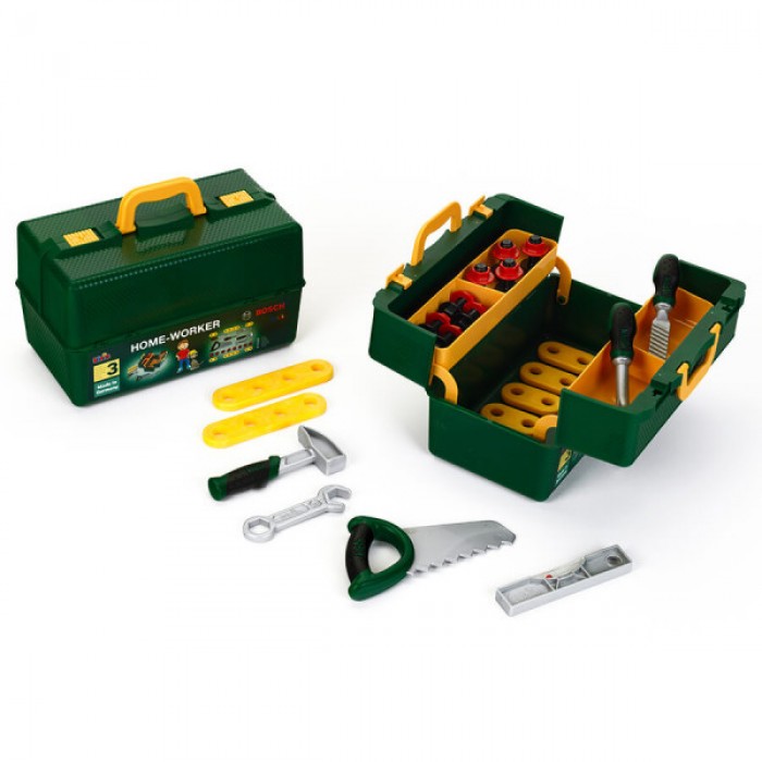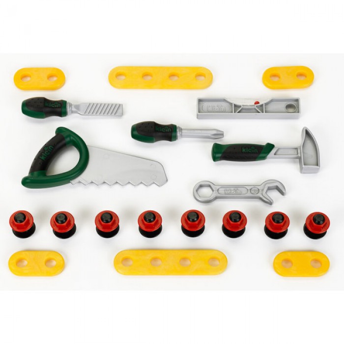 Набір для маленьких майстрів складається з: ящика для інструментів, що розкладається, молотка, викрутки, напилка, пилки, гайкового ключа, рівня, довгих планок, коротких планок, болтів з гайками. Всі елементи набору виготовлені з пластику та безпечні для дитини.