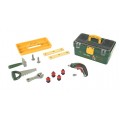 Міцний ящик з практичною ручкою містить якісні інструменти, які адаптовані до дитячих рук. Родзинкою набору є акумуляторна викрутка зі свердлом, що обертається, реалістичними звуками та світлом.