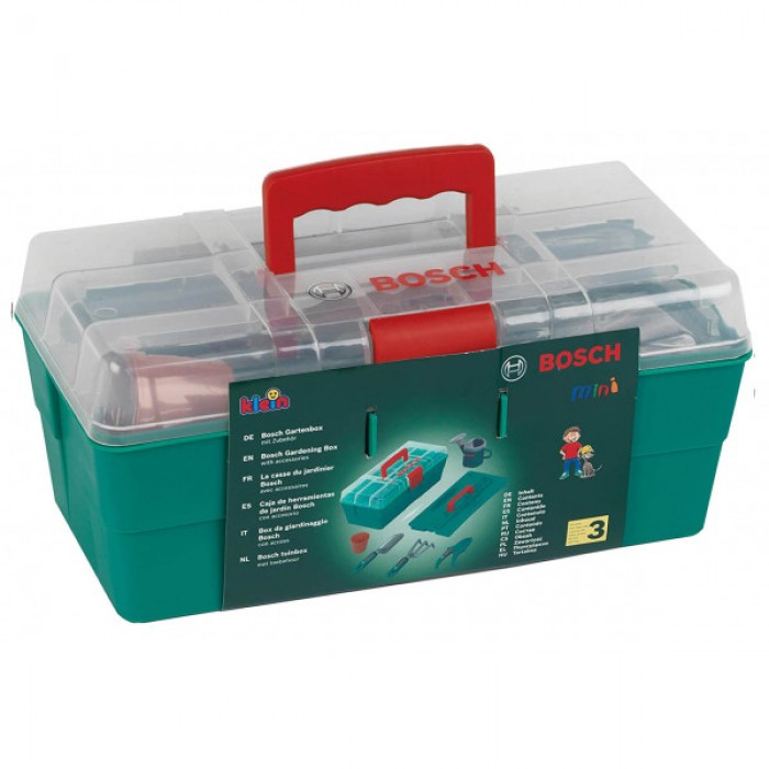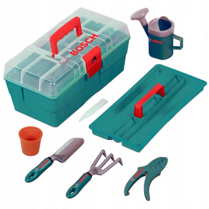 Садовий набір Klein Bosch Gardening Box підійде для домашнього вирощування квітів, овочів, трав. Складається з: садового ящика, горщика, лійки, секатора, лопати, граблів, інструкції з садівництва.
