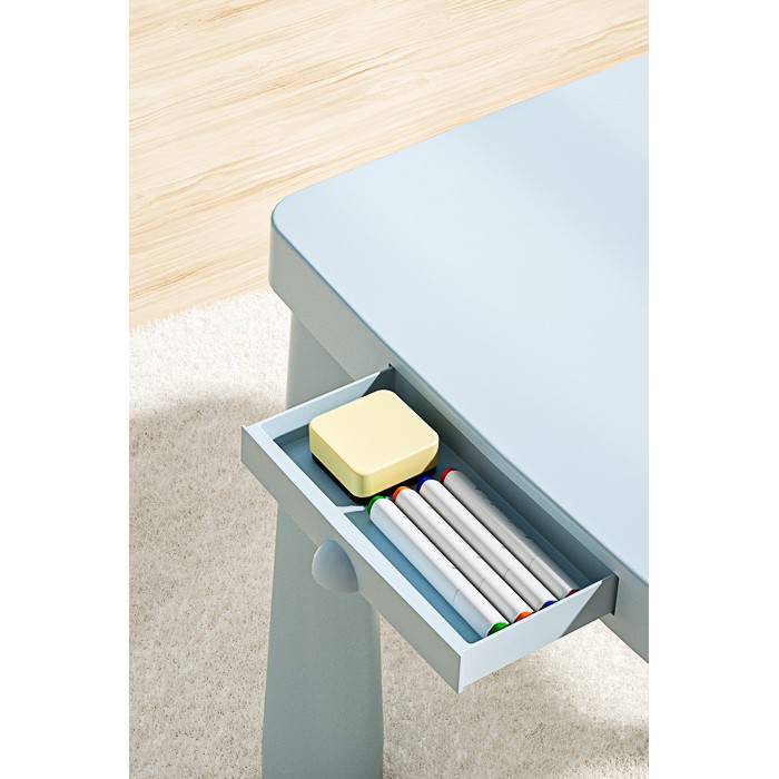 Дитячий функціональний столик POPPET «Mammut Total Baby Blue» та два стільці — сучасний комплект меблів для дітей від 1 до 6 років. Він поєднує простір для гри, навчання та творчості в одному стильному та практичному рішенні.