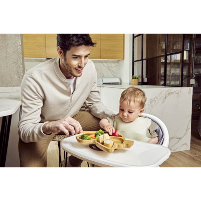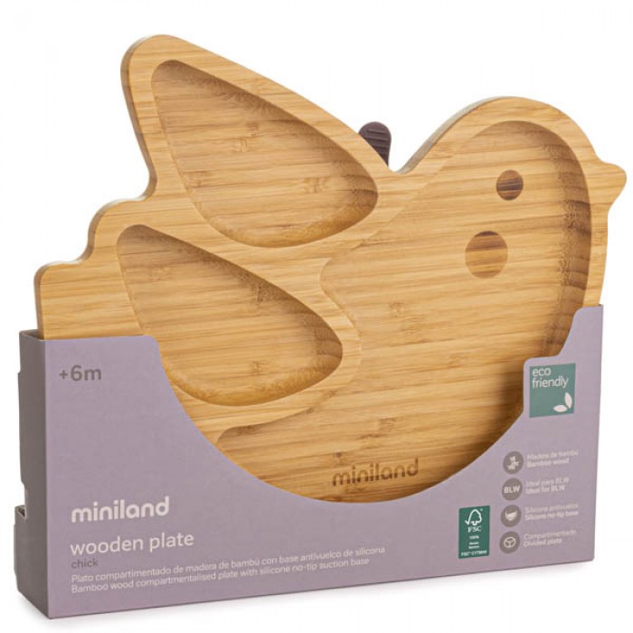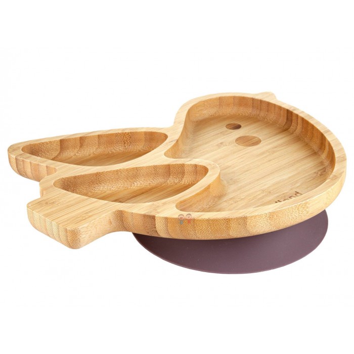 Тарілка у формі кумедного жабеня виготовлена з натурального екологічно чистого матеріалу - бамбука. Складається з трьох секцій (одна велика та 2 маленькі), для поділу продуктів. Щоб малюк не перекинув тарілку, вона має силіконову присоску на основі, тому вона легко і надійно кріпиться до дитячого стільця для годування або столу.