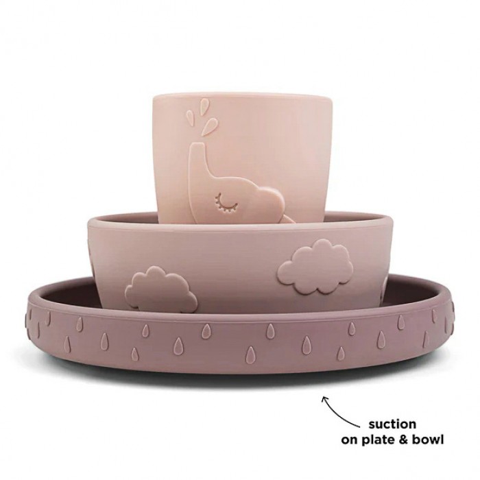 У комплект входять тарілка, миска об’ємом 250 мл та мінічашка об’ємом 120 мл. Головна перевага набору — надійні присоски на дні тарілки та миски, які фіксують посуд на столі та запобігають перевертанню під час їжі.