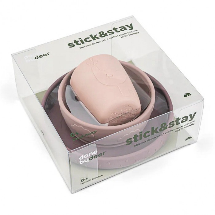 Силіконовий набір посуду Done by Deer Stick&Stay Deer Friends у ніжному пудровому відтінку — безпечне та функціональне рішення для щоденних прийомів їжі малюка.