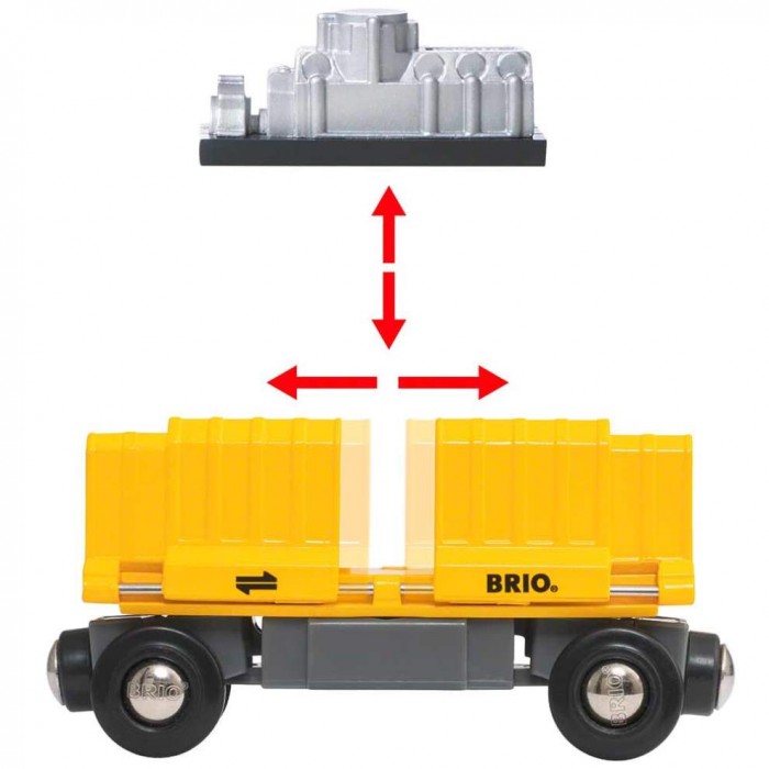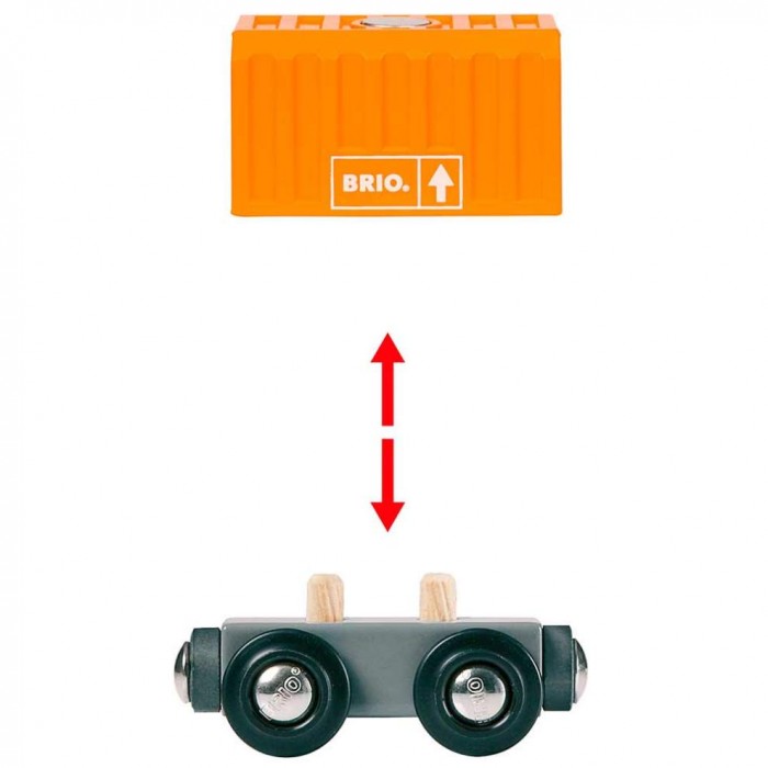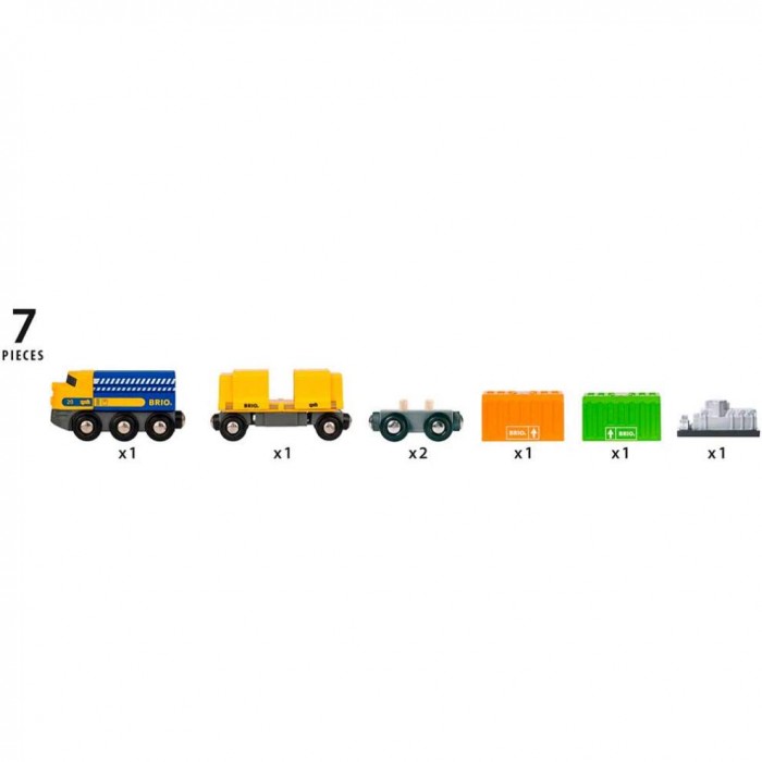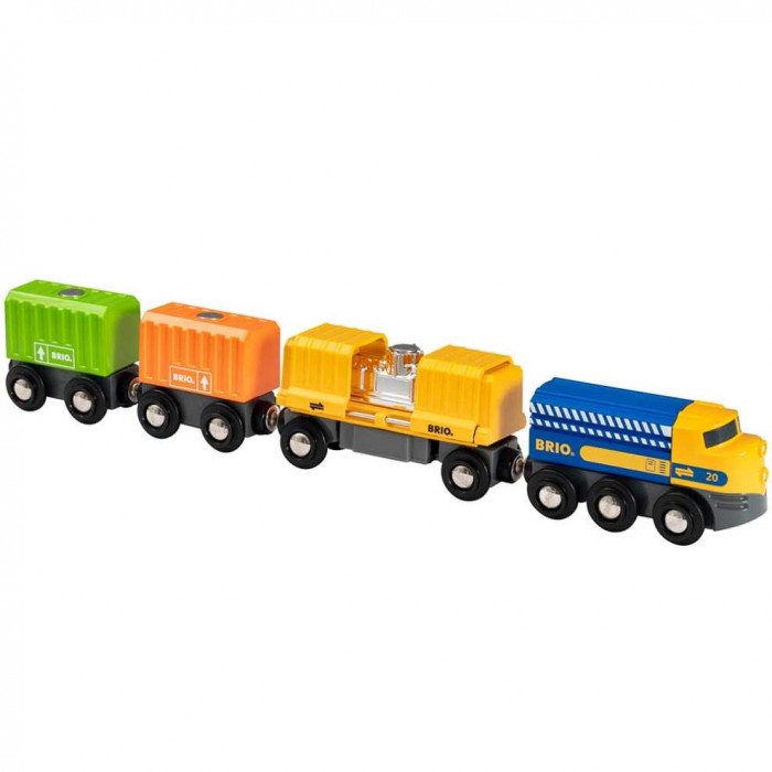 Цей супер довгий поїзд їде з трьома вагонами: два вантажні з контейнерами та спеціальним вагоном, у якому за розсувними дверцятами захований новий блискучий двигун. Кожен вантаж оснащений спеціальною магнітною вставкою і може бути розвантажений за допомогою будь-якого магнітного крана бренду BRIO або руками та уявою Вашої дитини. Завдяки універсальним магнітним кріпленням поїзд можна сполучити з іншими вагонами бренду. Просто підвезіть один до одного, і вони самостійно примагнітяться. Вирушайте у подорож з новим набором. Тепер можна винаходити ще більше ігрових сюжетів у місті BRIO.