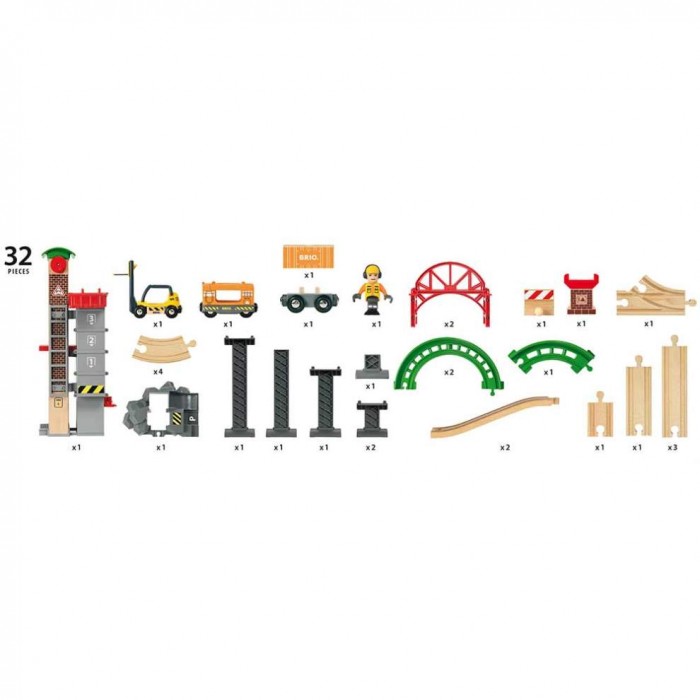 Ігровий набір BRIO дозволяє дитині відчути себе керівником будівельного майданчика та керувати процесом навантаження й розвантаження матеріалів. Підвозьте вагони зі будівельними матеріалами та за допомогою ліфта піднімайте їх на потрібну висоту, а після розвантаження швидко спускайте порожні вагони спеціальною дорогою.