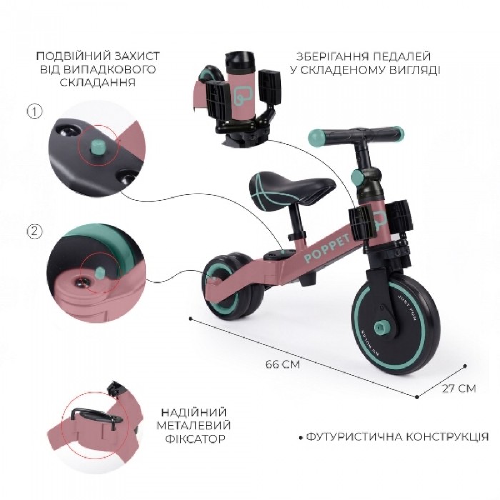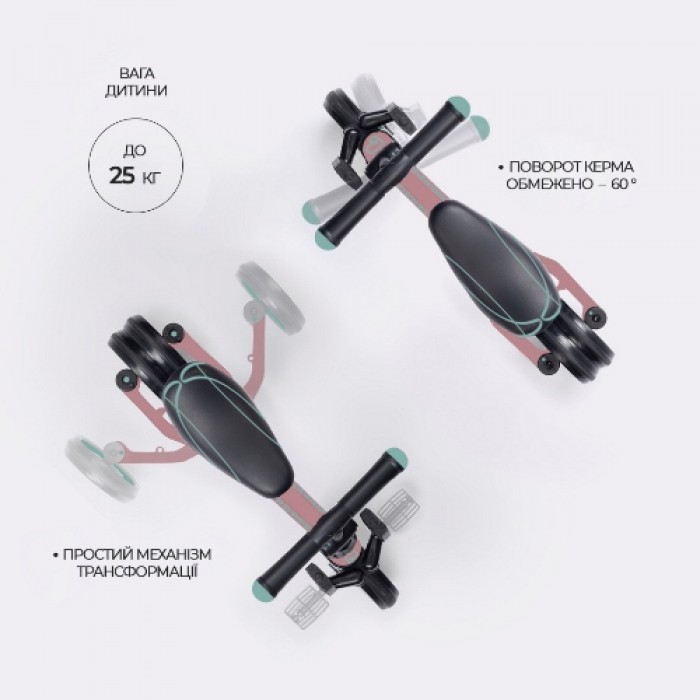 Рожево-м'ятний біговел-трансформер 3 в 1 має різний функціонал можливостей: відштовхуючись ніжками від землі на триколісному біговелі, найменші малюки отримають масу позитивних емоцій від комфортної та безпечної їзди; у міру дорослішання та опанування необхідних навичок управління, дитина зможе перейти від триколісного біговелу до двоколісного, достатньо скласти задні колеса і відрегулювати висоту сидіння; але варто лише опустити педалі - і ось новий виклик для малюка - класичний велосипед.