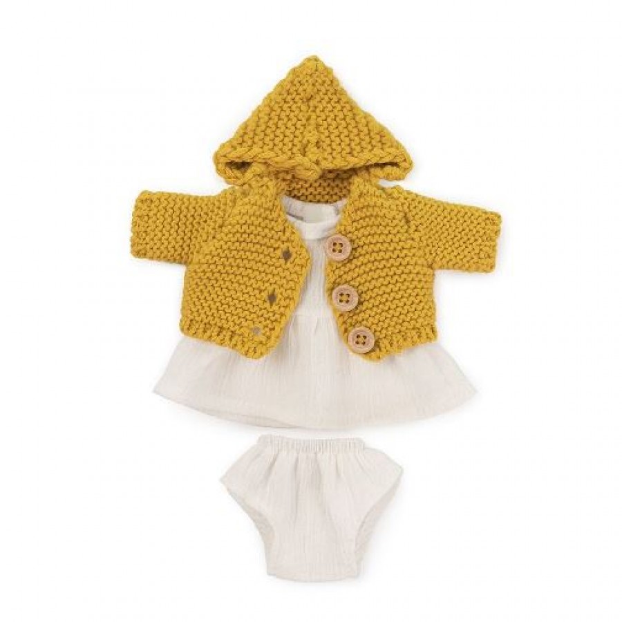 Стильний комплект для ляльки Miniland 21 см складається з сукні, жакету та трусиків. У наборі йде вішалка, тому улюблений комплект не загубиться та не пам'ятається. До того ж, малюк у такий спосіб навчається акуратності.