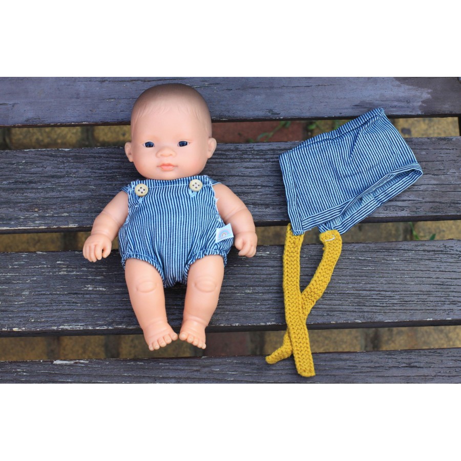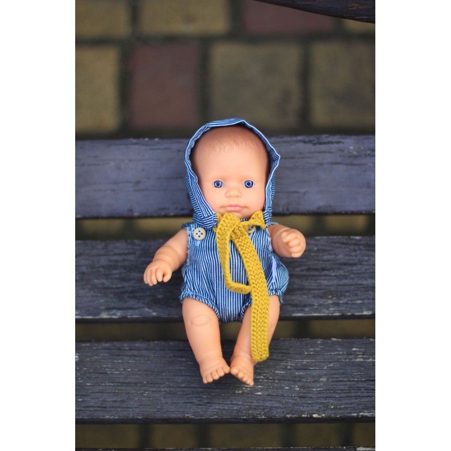 Стильний комплект для ляльки Miniland 21 см складається зі смугастих шортиків та шапочки на зав'язках. У наборі йде вішалка, тому улюблений комплект не загубиться та не пам'ятається. До того ж, малюк у такий спосіб навчається акуратності.