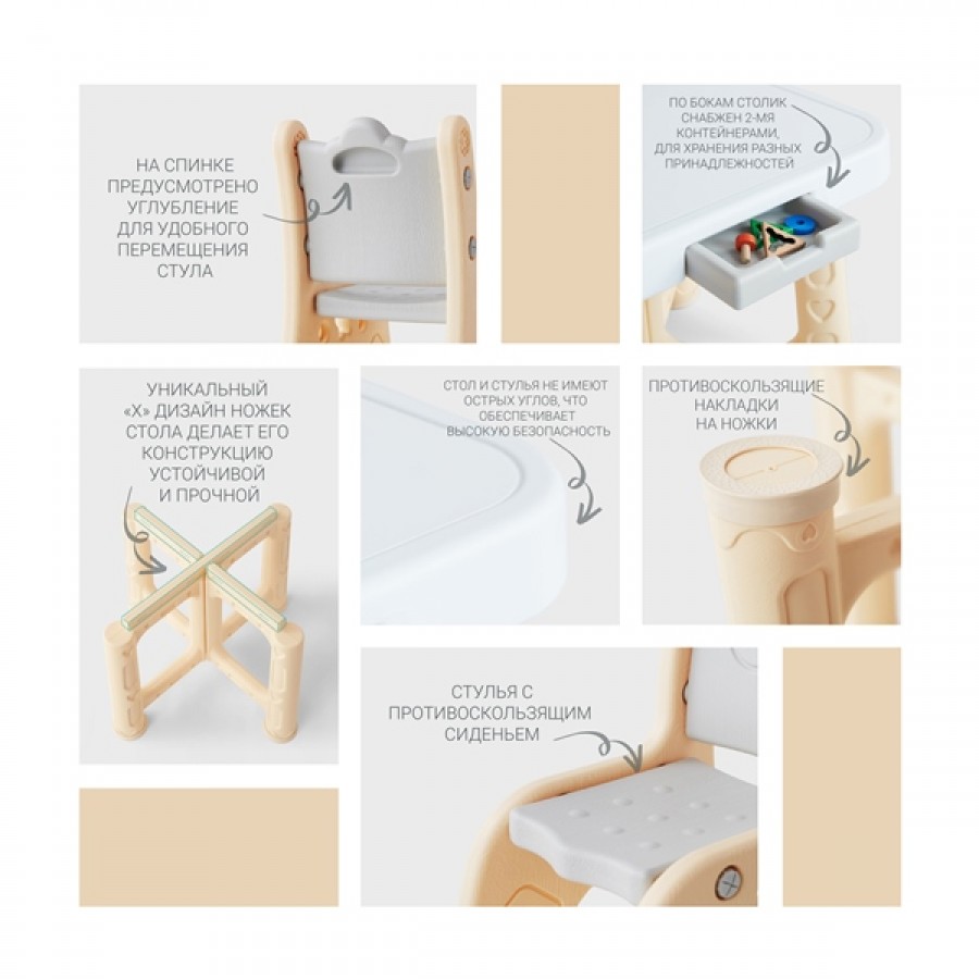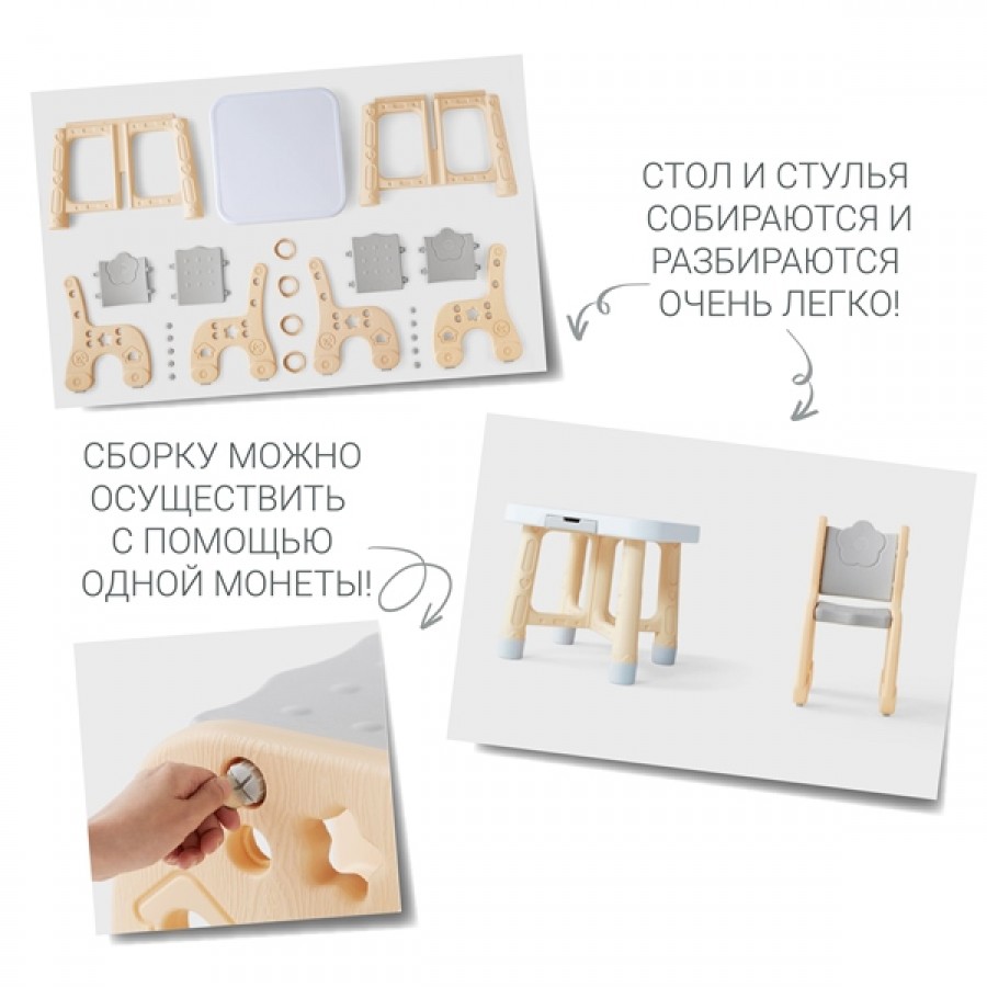 ● Регулювання висоти столу і стільців згідно з ростом дитини: ˅ Для столу, в комплект входять спеціальні насадки на ніжки, що дозволяють збільшити висоту столика на 8 см. ˅ Для стільців, передбачені додаткові отвори в корпусі, що дозволяють збільшити висоту сидіння на 4 см.