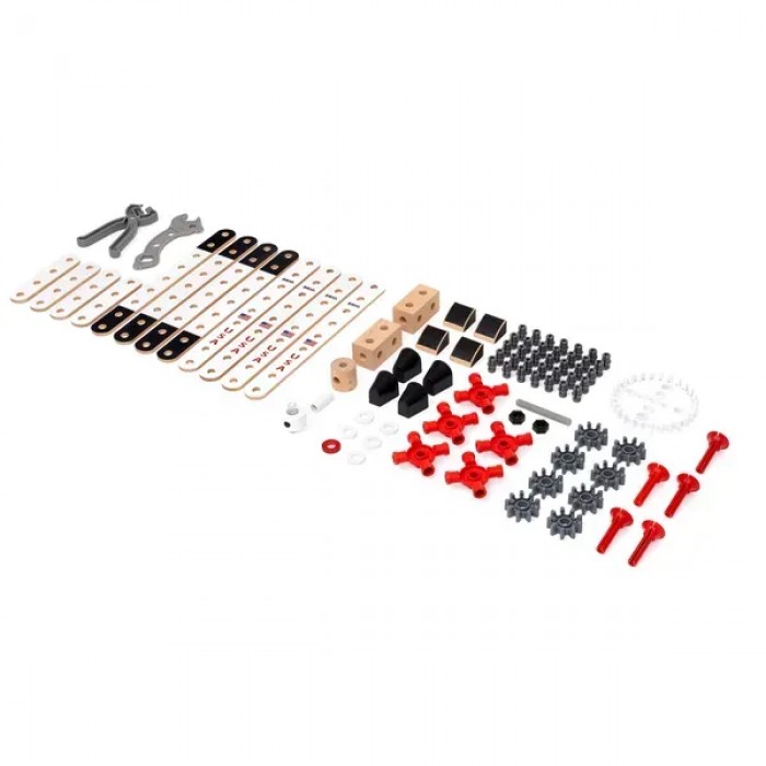У наборі: 12 дерев’яних планок, 11 блоків, 9 шестерень, 5 цвяхів, світловий модуль, пасатижі, гайковий ключ, додаткові деталі та буклет з ідеями для складання.