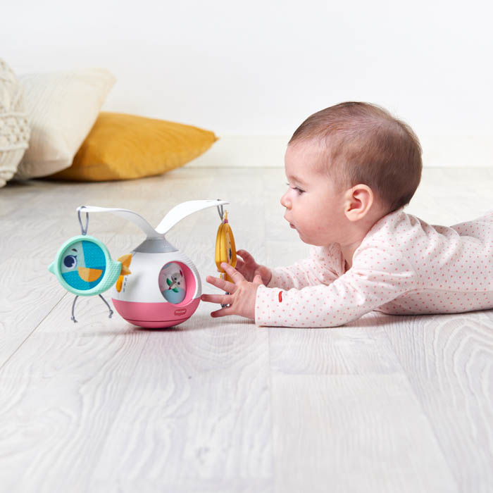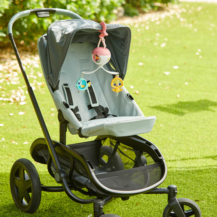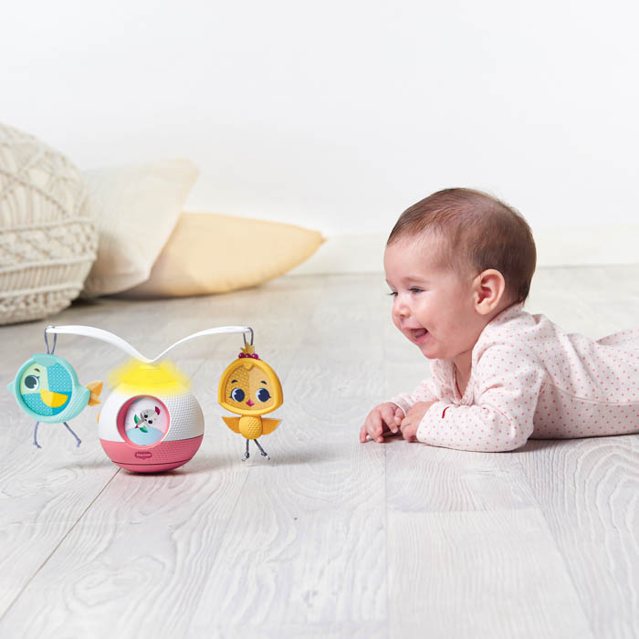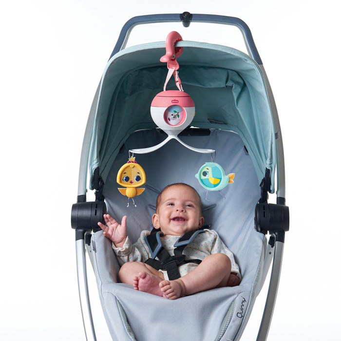 Інноваційна конструкція дозволяє малюкові розглядати мобіль, лежачи на животику. Це допомагає стимулювати рухову активність та зміцнювати м’язи під час гри.