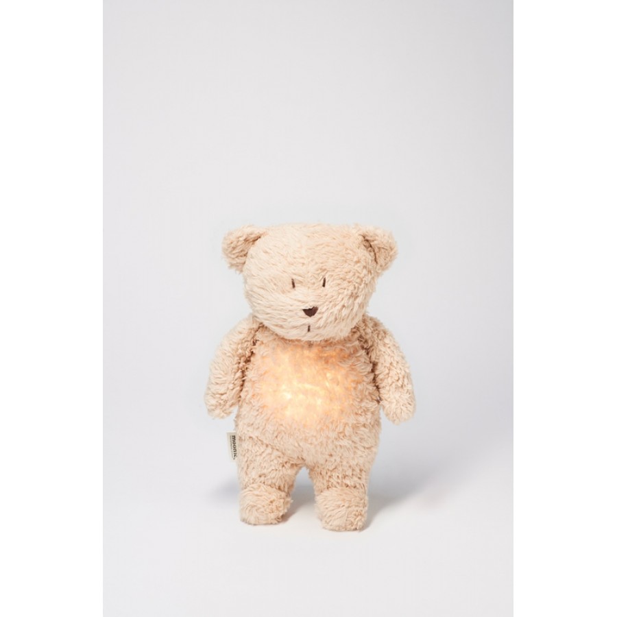 Ведмедик Moonie - м'яка іграшка, в животику у якій причаївся світлодіодний нічник. Він створює м'яке світло для комфортного засинання малюка. Підходить дітям будь-якого віку, починаючи з перших днів життя. Moonie видає 5 видів звуків на будь-який смак. Кожен з них допомагає дитині відчувати себе в безпеці і спокійно засинати.