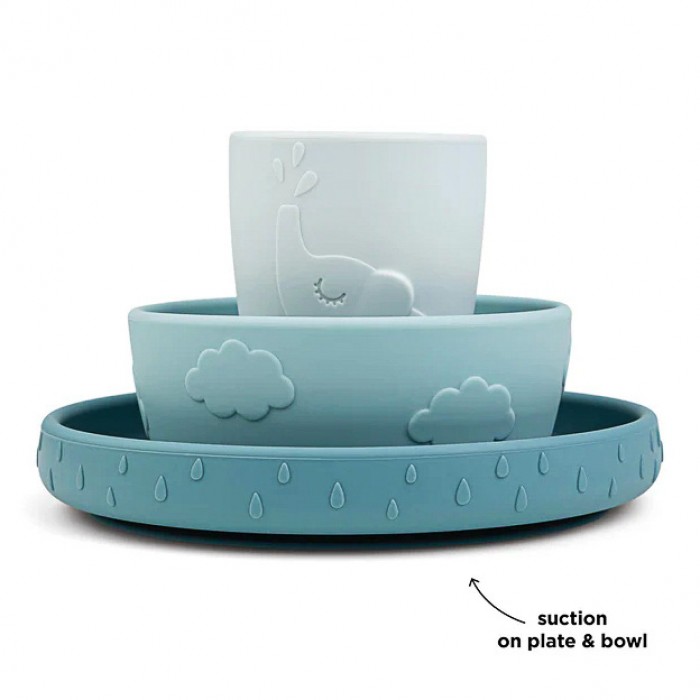 Силіконовий набір посуду Done by Deer Stick&Stay Deer Friends у ніжному синьому кольорі — це зручний комплект для першого прикорму та навчання малюка самостійному харчуванню. До набору входять тарілка, миска (250 мл) та мінічашка (120 мл).