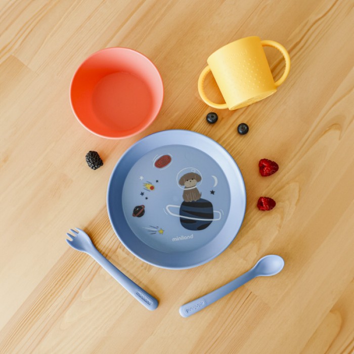 Набір дитячого посуду на 5 предметів ідеально підходить для переходу дитини до самостійного харчування. Він включає плоску тарілку з піднятими краями, глибоку мисочку, зручну чашку з текстурованими ручками для кращого захоплення дитячими ручками, а також ложку і вилку із закругленими краями, щоб запобігти пошкодженню ясен дитини. Набір виготовлений в Іспанії з безпечного міцного поліпропілену, який не вбирає запахи, легко очищується від забруднень, та не містить бісфенол А.