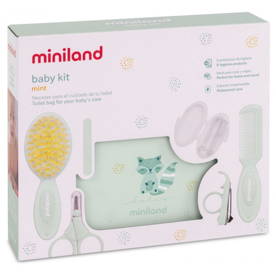 Набір для догляду за дитиною Miniland Baby Kit Mint складається з необхідних елементів для щоденного догляду за дитиною: гребінця, щітки для волосся з натуральною щетиною, практичних ножиць із закругленими кінцями, силіконової щіточки для ясен, кусачок та пілочок для нігтів дитини. Всі елементи розташовані у симпатичній косметичці, яку завжди зручно брати із собою.