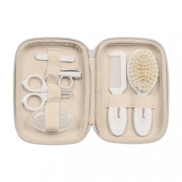 Набір для догляду за дитиною Miniland Baby Kit Valencia складається з необхідних елементів для щоденного догляду за дитиною: гребінця, щітки для волосся з натуральною щетиною, практичних ножиць із закругленими кінцями, силіконової щіточки для ясен, кусачок та пілочок для нігтів дитини. Всі елементи розташовані у симпатичній косметичці, яку завжди зручно брати із собою.