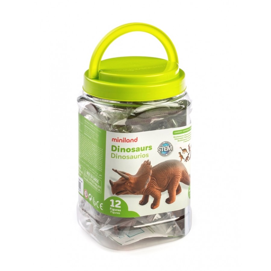 Набір фігурок динозаврів Miniland dinosaurs складається з 12 різних тварин, що мають правильні пропорції розміру і ваги відносно один одного. Набір підходить для вивчення різновидів динозаврів як вдома, так і в дитячих садах і початковій школі. Динозаври мають правильний окрас і структуру. Всі фігурки цільнолиті, без рухомих елементів, мають вагу, не пустотілі.