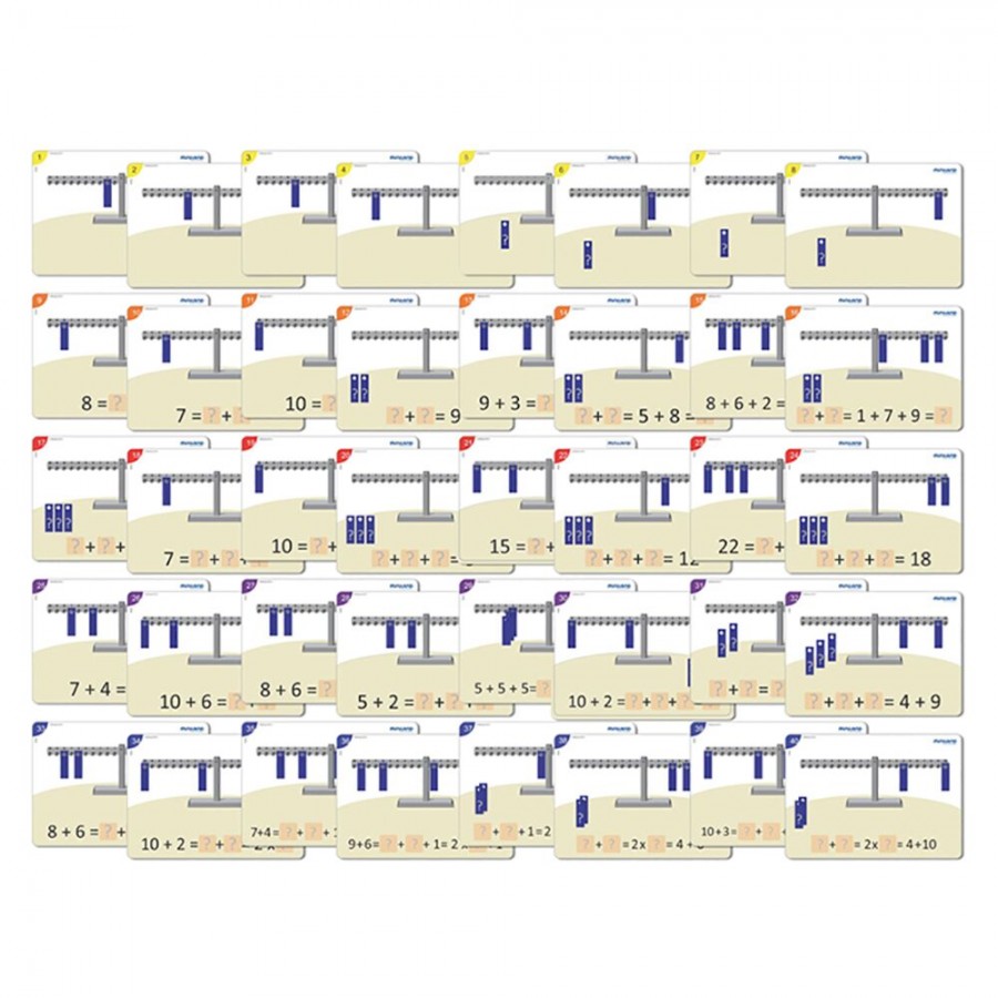 Пластикові картки із завданнями для роботи з математичними вагами.