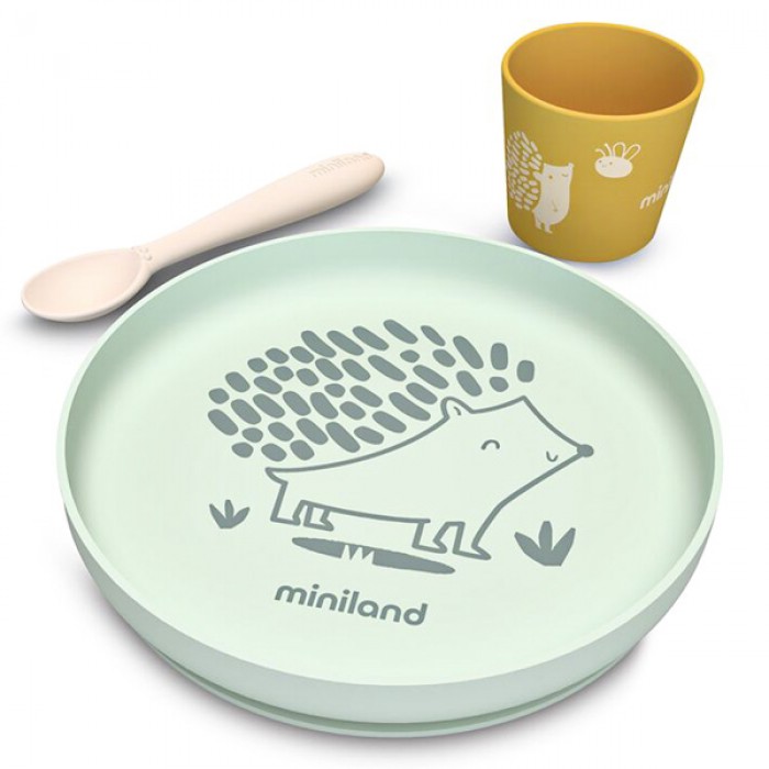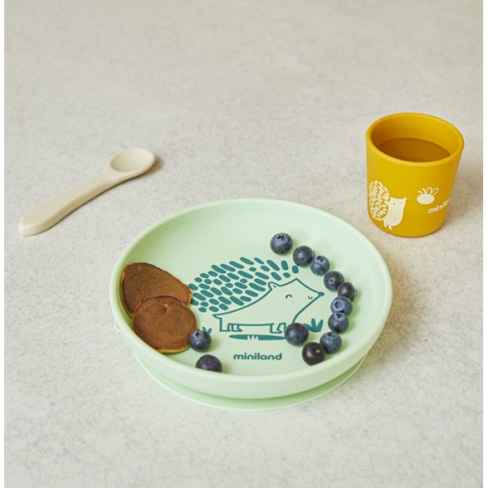 Силіконовий дитячий посуд Set Forest від Miniland — практичний набір для знайомства малюка з самостійним харчуванням за методом Baby Led Weaning (BLW). До комплекту входять тарілка з бортиками, ергономічна ложка та стаканчик для напоїв, які підходять для щоденного використання вдома та в дорозі.
