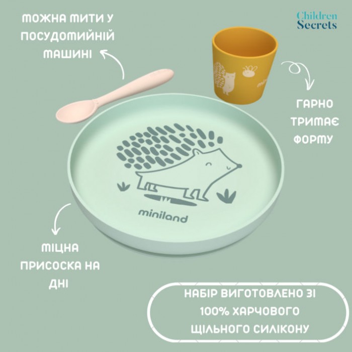 Набір виготовлений зі 100% щільного харчового силікону, який є безпечним, довговічним і приємним на дотик. Цілісна тарілка має підняті краї, а надійна присоска на дні дозволяє добре зафіксувати її на поверхні, забезпечуючи стійкість і запобігаючи ковзанню або падінню під час годування. Ложка з округлими краями не травмує ніжні ясна та зручно лежить у дитячій ручці. Стаканчик достатньо щільний і добре тримає форму навіть з гарячими напоями.