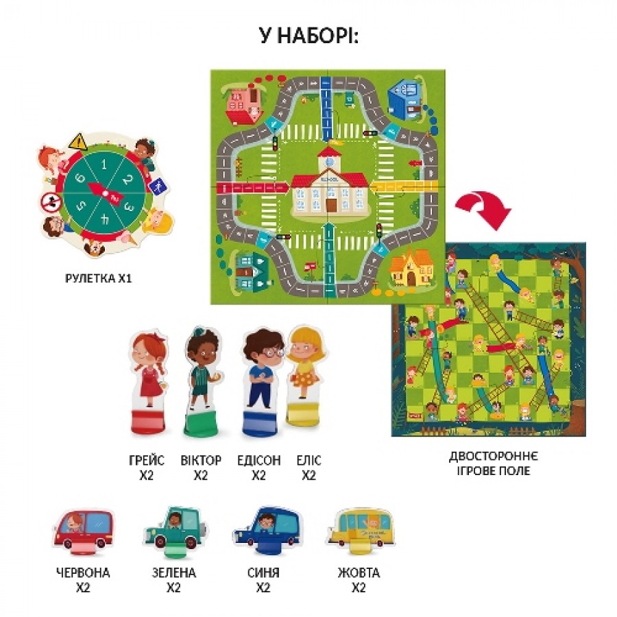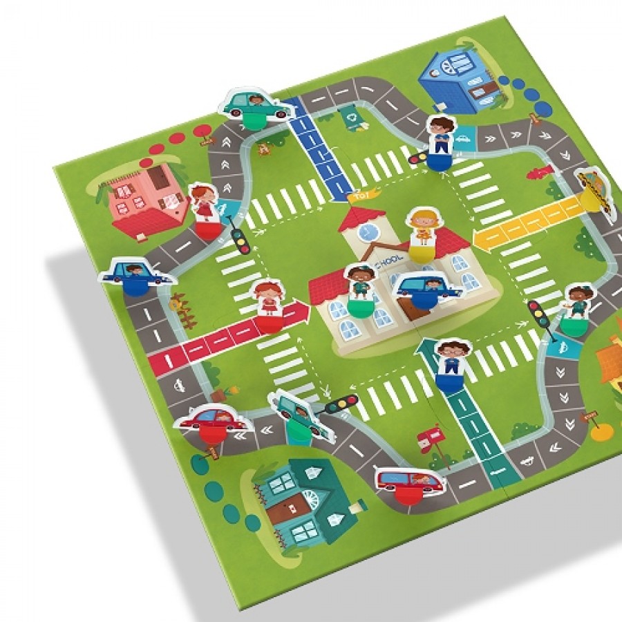 Гравці крутять ігрову рулетку, починаючи з наймолодшого. Кому першому випаде 6, починає гру. Тільки при випаданні 6 можна виводити чергову фігурку на загальну доріжку. Також цифра 6 дає право на позачерговий хід. Гравець може вибирати ходити йому далі вже наявними фігурками на полі або вивести в гру ще одну фігурку. Рух фігурок по ігровому полю йде за годинниковою стрілкою. Фігурки інших гравців можна обганяти (перестрибувати через них). Якщо ж ваша фігурка машинки потрапляє в одну клітинку з фігуркою суперника, то фігурка суперника повертається на вихідну позицію - додому і там чекає чергову 6, щоб знову увійти в гру. Коли фігурка виявляється біля світлофора, гравець крутить ігрову рулетку, якщо йому випадає зелене світло, він може ходити. Перемагає той, хто приведе всі свої фігурки першими в школу! Вивчіть прості правила дорожнього руху і розкажіть дітям про поведінку на дорозі на шляху до школи.