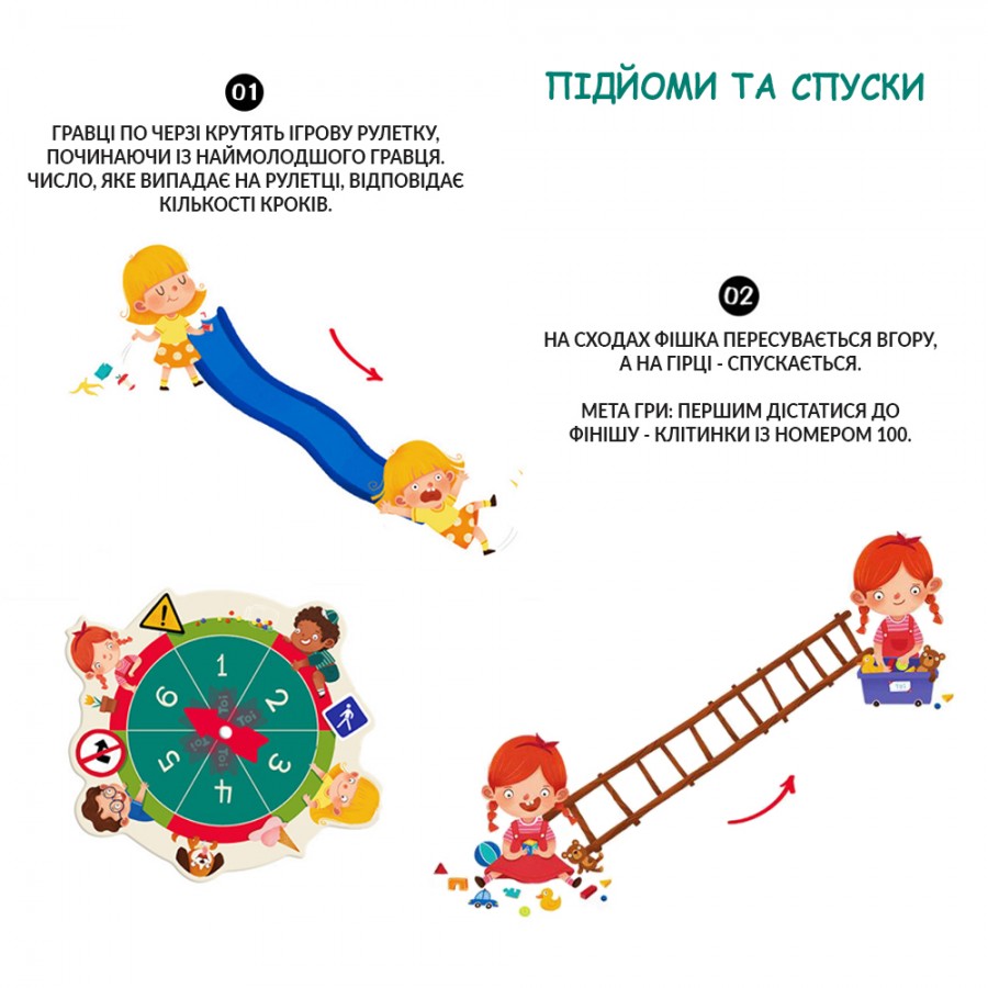Гру починає наймолодший, розкрутивши рулетку. Гравці по черзі крутять ігрову рулетку і згідно числу, що випало, пересувають свої фішки на відповідну кількість клітинок на полі. Мета гри: першим дістатися до фінішу - клітинки з номером 100. Якщо фішка зупинилася на клітинці зі сходами - гравець пересуває фішку вгору до кінця сходів. Якщо ж фішка зупинилася на клітинці з гіркою - фішка опускається вниз.