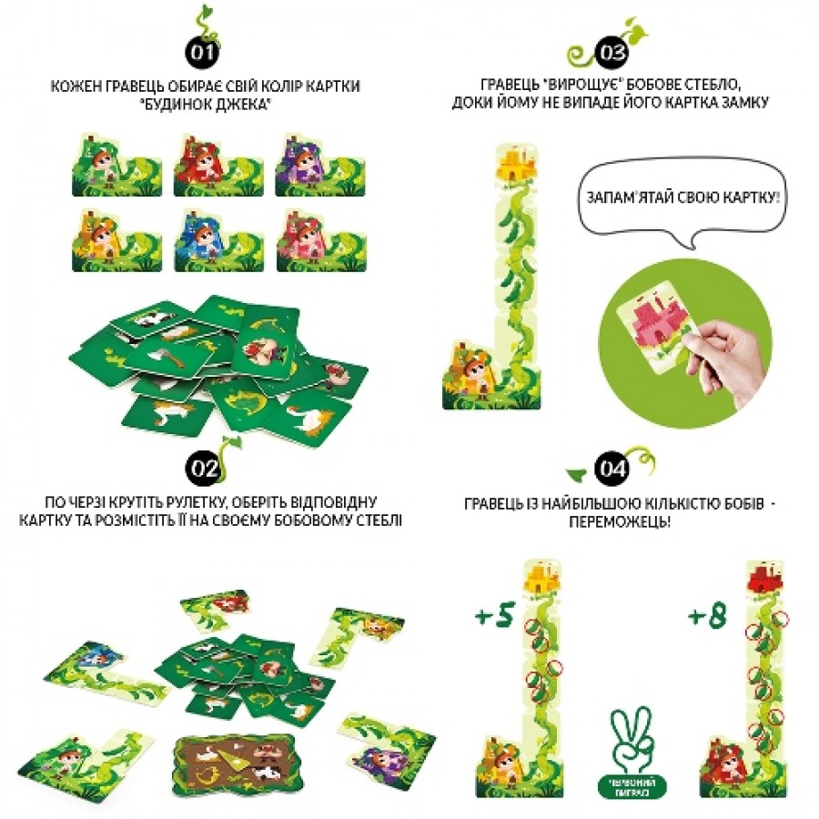 Кожен гравець вибирає собі карту гравця "будинок Джека" свого кольору. Перед початком гравці розкладають картки сорочкою вгору і визначають наймолодшого за віком учасника гри. Починаючи з наймолодшого, гравці крутять ігрову рулетку за годинниковою стрілкою, вибирають картку з тим же малюнком, що випала на рулетці, із колоди. Гравці розміщують отриману картку на власне бобове стебло. Якщо вам попалася карта замку відмінного кольору від вашого будинку, вам необхідно повернути карту в колоду. Гравець "вирощує" бобове стебло до тих пір, поки йому не випаде карта замку його кольору. Залишилося тільки підрахувати, скільки бобів вам вдалося зібрати. Той, у кого їх найбільше - переміг!