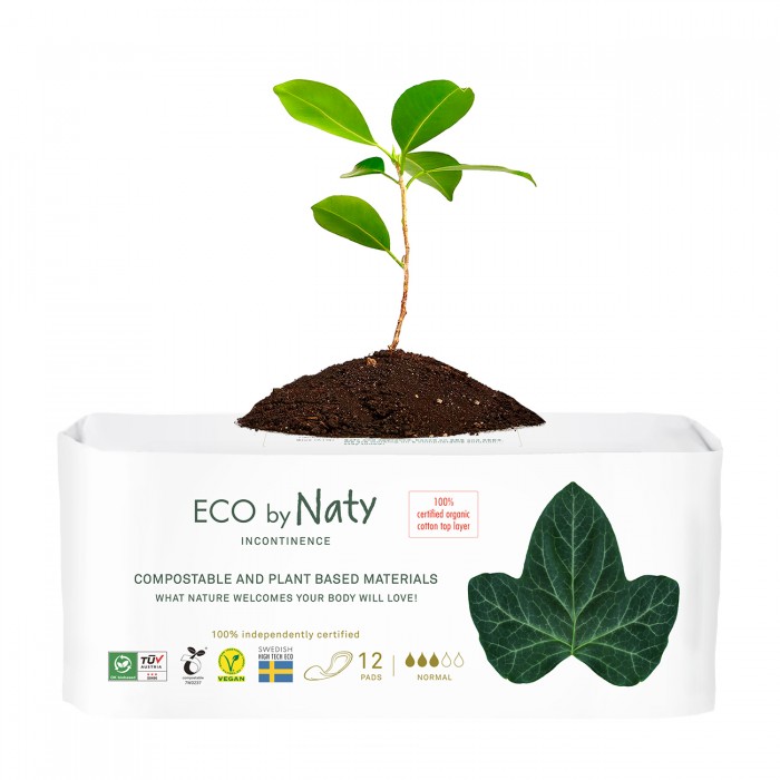 Одноразові органічні урологічні прокладки без крилець Eco by Naty (рівень поглинання – 2,5 краплі) виготовлені зі 100% органічної бавовни. Прокладки відмінно вбирають виділення та забезпечують безпечний захист шкіри, зберігаючи відчуття сухості та комфорту. Прокладки та пакувальні матеріали зроблені зі 100% сертифікованих компостованих матеріалів.