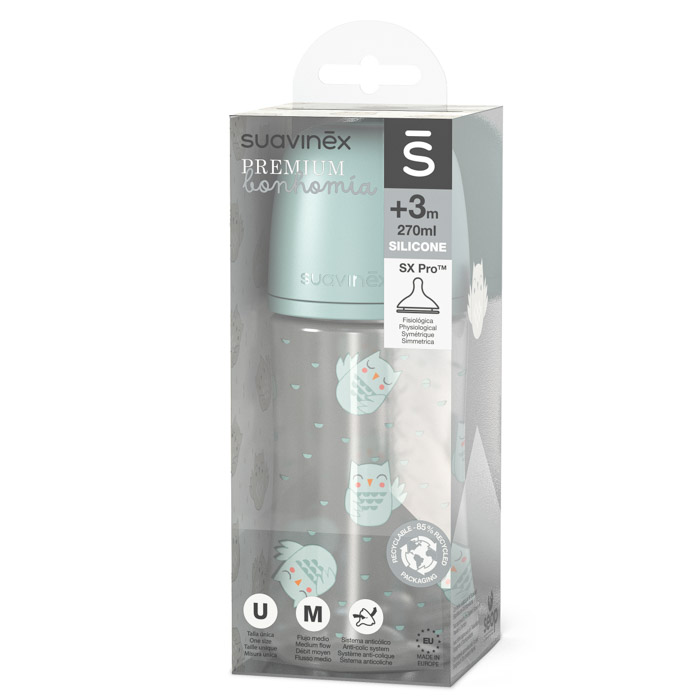Пляшечка Suavinex Bonhomia об’ємом 270 мл створена для зручного та спокійного годування малюка. Фізіологічна соска з повільним потоком сприяє акуратній подачі рідини та підтримує природний ритм смоктання.
