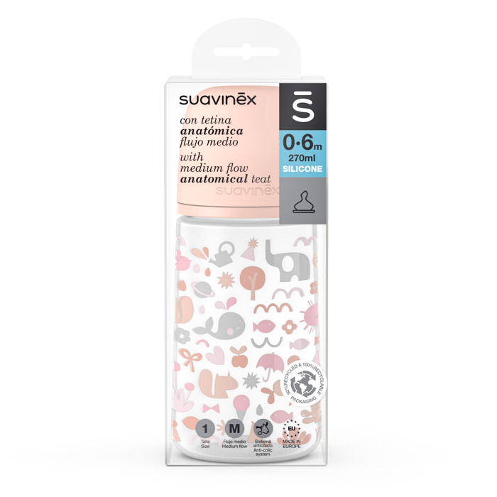 Пляшечка Suavinex об’ємом 270 мл з анатомічною соскою та середнім потоком створена для комфортного й природного годування малюка. Вона підходить для щоденного використання та забезпечує збалансовану подачу рідини.