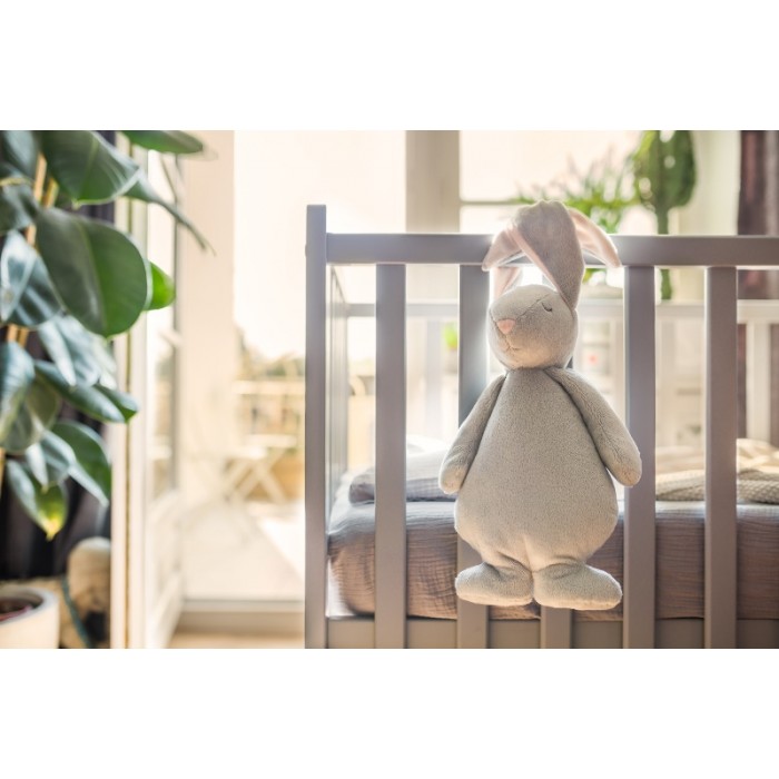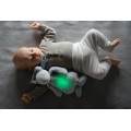 Усередині зайчика є модуль зі звуками та нічником: 5 заспокійливих аудіорежимів і 7 кольорів світла. Світло м’яке й безпечне, не нагрівається. А датчик плачу автоматично вмикає звук, якщо малюк прокинувся та почав непокоїтися.