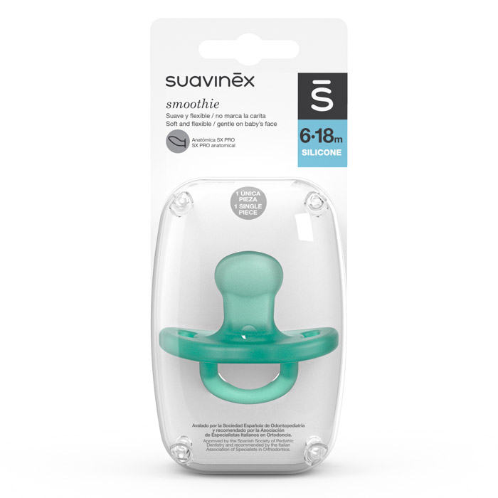 Силіконова анатомічна пустушка Suavinex створена для дітей віком від 6 до 18 місяців. Анатомічна форма враховує природне положення язика та піднебіння, забезпечуючи комфортне й фізіологічне смоктання.