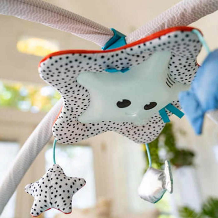 Яскраві ілюстрації з морською тематикою та контрастні кольори стимулюють зорове сприйняття дитини. Об’ємні ігрові елементи спонукають малюка торкатися, тягнутися й досліджувати навколишній світ, розвиваючи дрібну моторику рук.