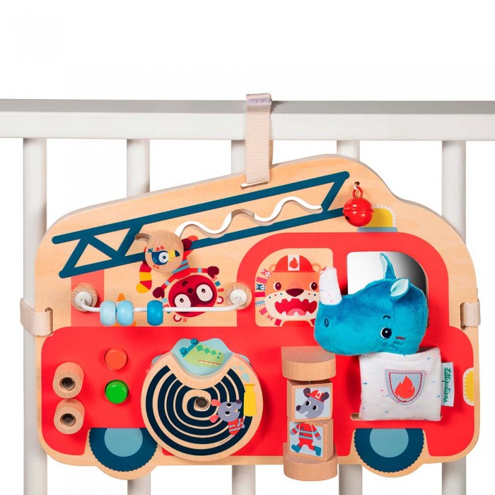 Бизиборд Lilliputiens «Пожарная машина» — компактная развивающая панель, которую удобно брать с собой: благодаря креплениям её можно зафиксировать на коляске/кроватке/манеже или играть дома. Главный герой — носорог Мариус: посадите его в машинку и отправляйтесь в «спасательную» поездку.