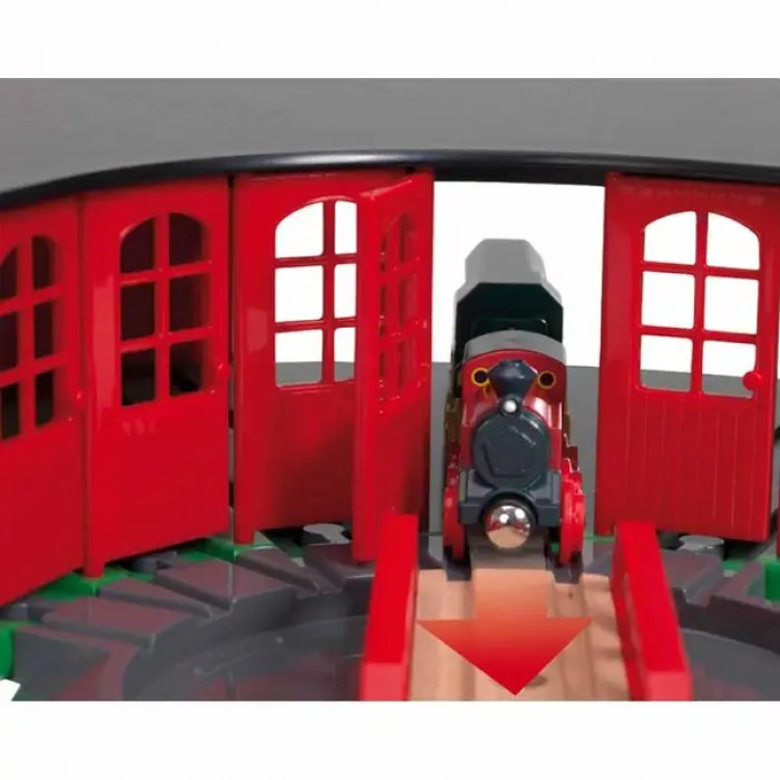 Просторная конструкция рассчитана на одновременное размещение до пяти поездов. Пять входов спереди соединены с удобной поворотной платформой, которая помогает направлять локомотивы и вагоны в нужное направление. Это делает игровой процесс более реалистичным и увлекательным.