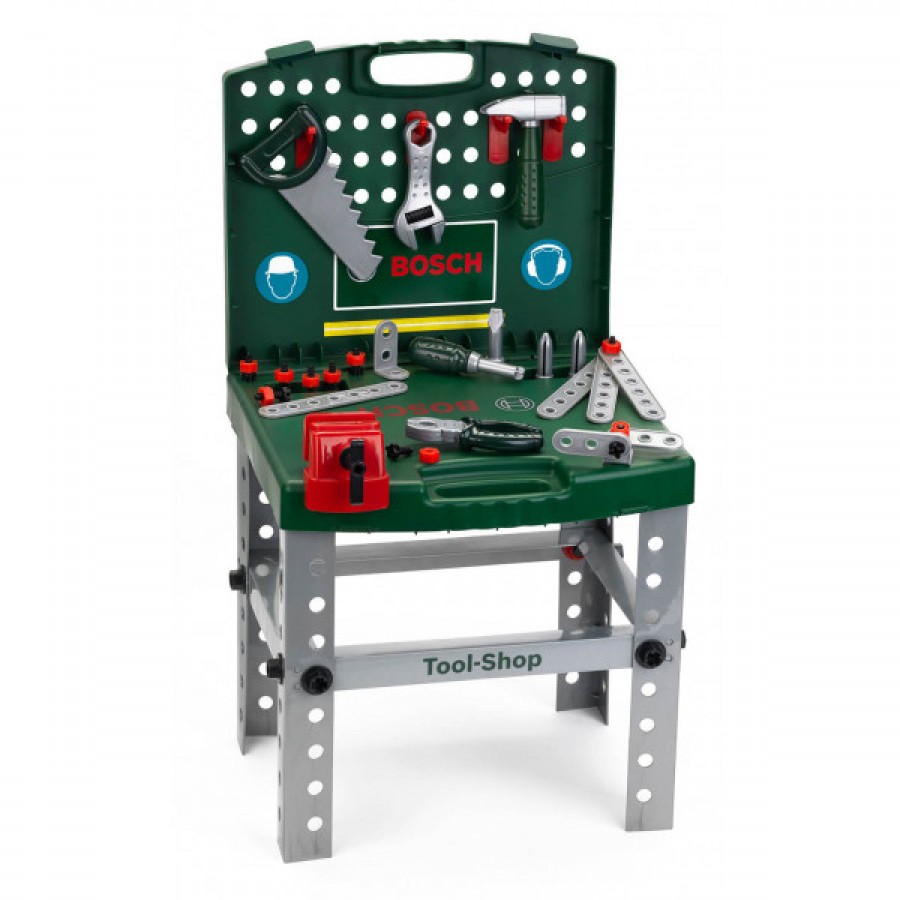В этом наборе Klein Bosch Tool-Shop есть все: молоток, отвертка, пилка, плоскогубцы, гаечный ключ, винты, рейки, гайки, стол, который легко трансформируется в чемодан.