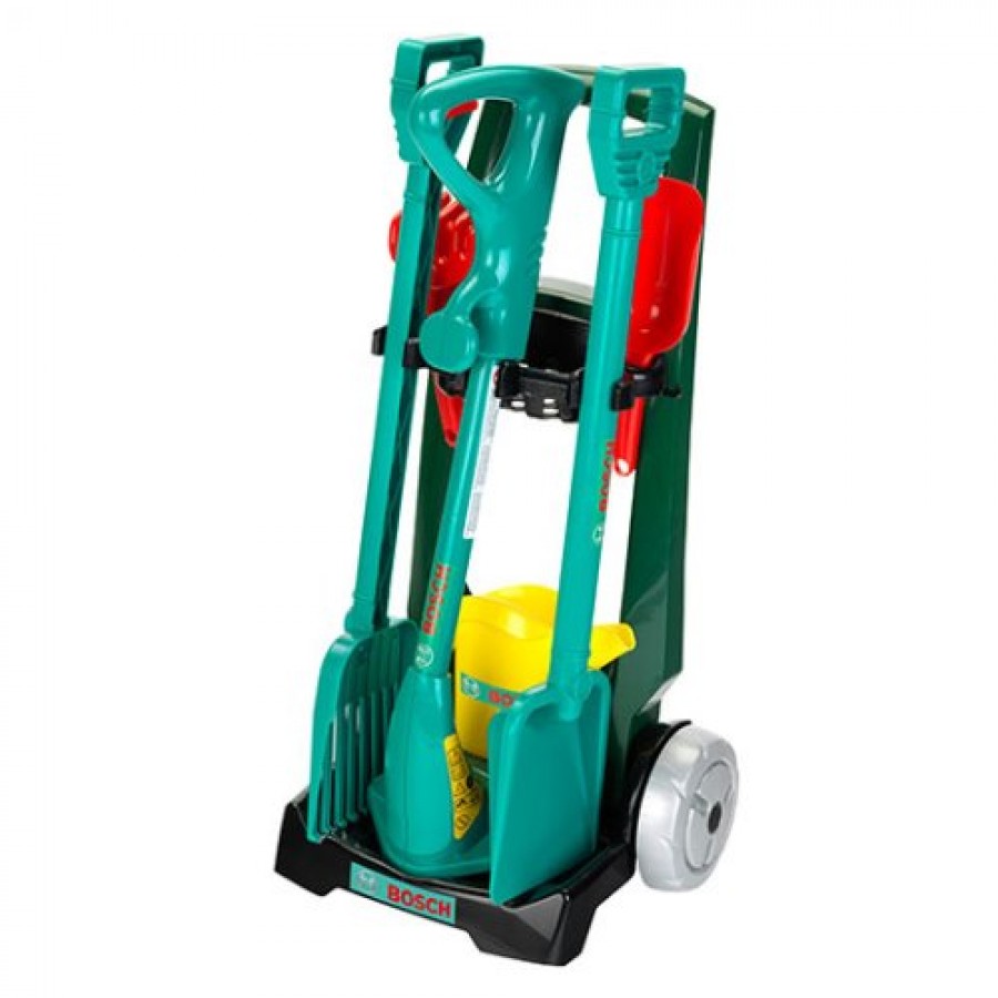 Это набор садовых инструментов для детей. Состоит из: 2 лопат, 2 граблей, воронки и триммера. Все инструменты компактно хранятся на специальной тележке.