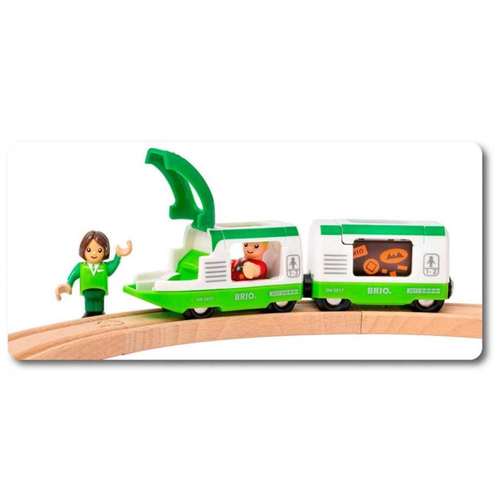 Идеальный набор для начала знакомства с системой детских железных дорог BRIO, который включает в себя всё необходимое и, в тоже время, не занимает много места. Садите фигурку машиниста в механический поезд и начнём наше путешествие. Подъезжаем к светофору, остановитесь на красный свет, переключите его на зёленый. Всё, теперь можно ехать дальше. Подъезжаем к остановке, на лавочке уже заждался пассажир. Посадите его в вагон и продолжайте игру.