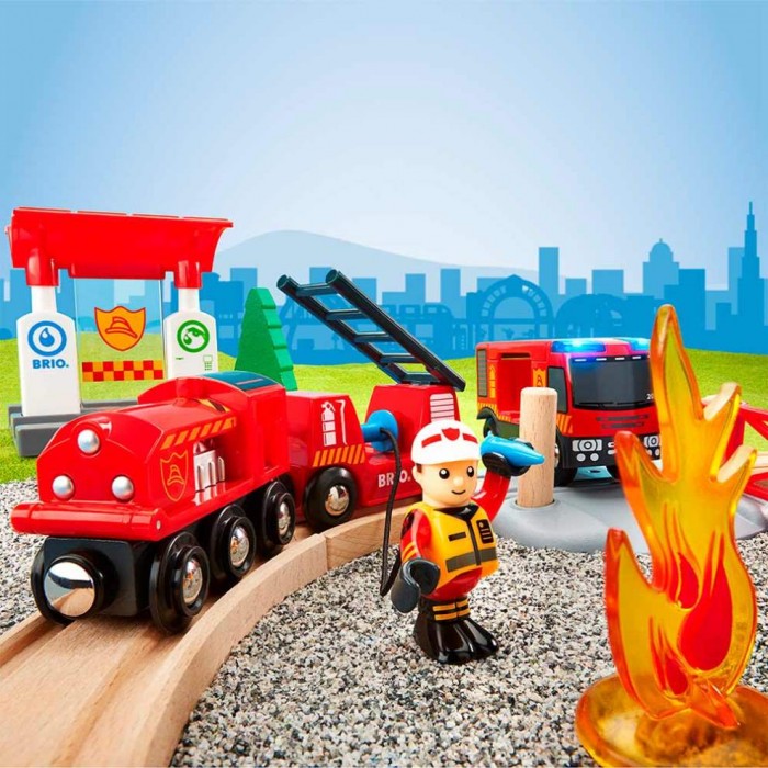 Детская железная дорога BRIO «Пожарная станция» — это сюжетный игровой набор, состоящий из 18 элементов, который позволяет ребёнку почувствовать себя настоящим пожарным и разыгрывать спасательные операции в городе BRIO World.
