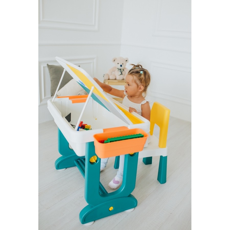 ● Столешница стола может превращаться в мольберт, в игровую панель для конструктора LEGO, а также их аналогов, в поверхность для рисования, письма, занятий или обеда.