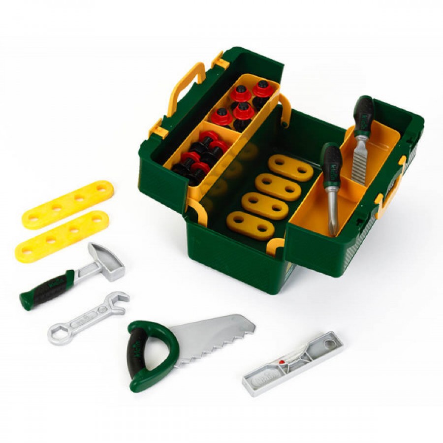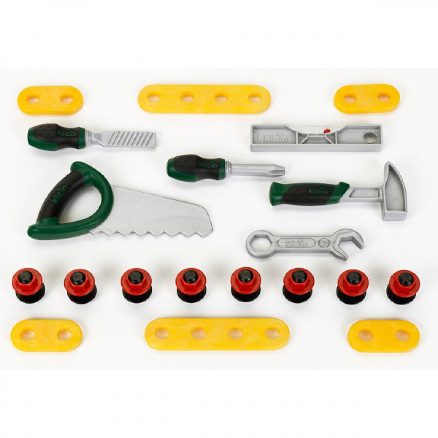 Набор для маленьких мастеров состоит из: ящика для разлагающихся инструментов, молотка, отвертки, напильника, пилы, гаечного ключа, уровня, длинных планок, коротких планок, болтов с гайками. Все элементы набора изготовлены из пластика и безопасны для ребенка.