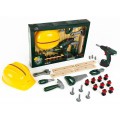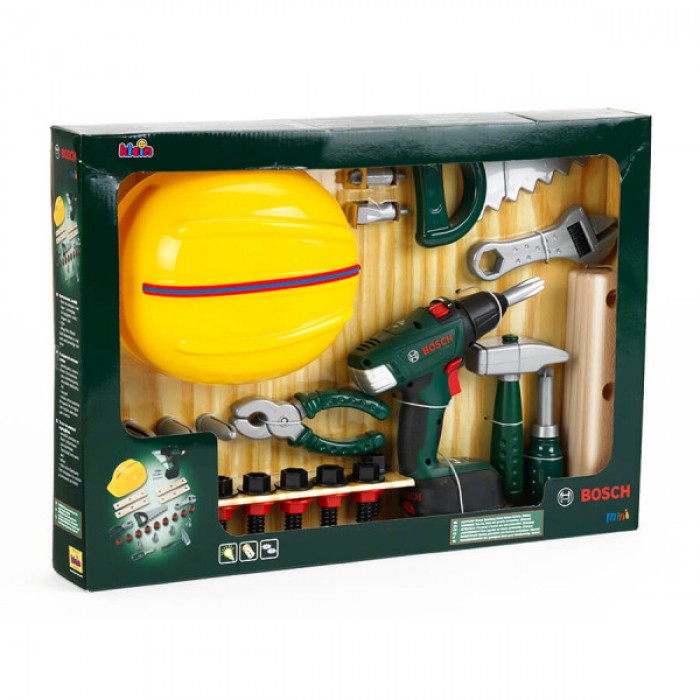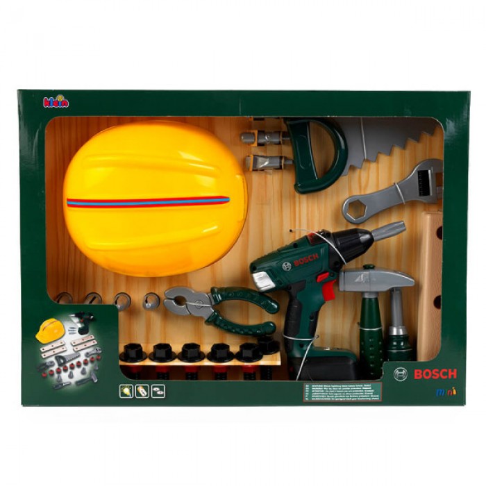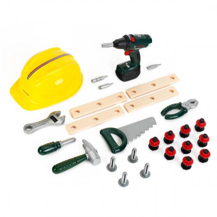 Набор игрушек Bosch из 36 предметов состоит из: шлема, аккумуляторного шуруповерта Bosch II, разводного ключа, плоскогубцев, отвертки, молотка, пилы, шурупов, гвоздей, бит и планок.