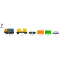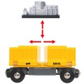 Этот супердлинный поезд поезд едет с тремя вагонами: два грузовых с контейнерами и специальным вагоном, в котором за раздвижными дверцами спрятан новый блестящий двигатель. Каждый груз оснащен специальной магнитной вставкой и может быть разгружен с помощью любого магнитного крана бренда BRIO или руками и воображением Вашего ребенка.