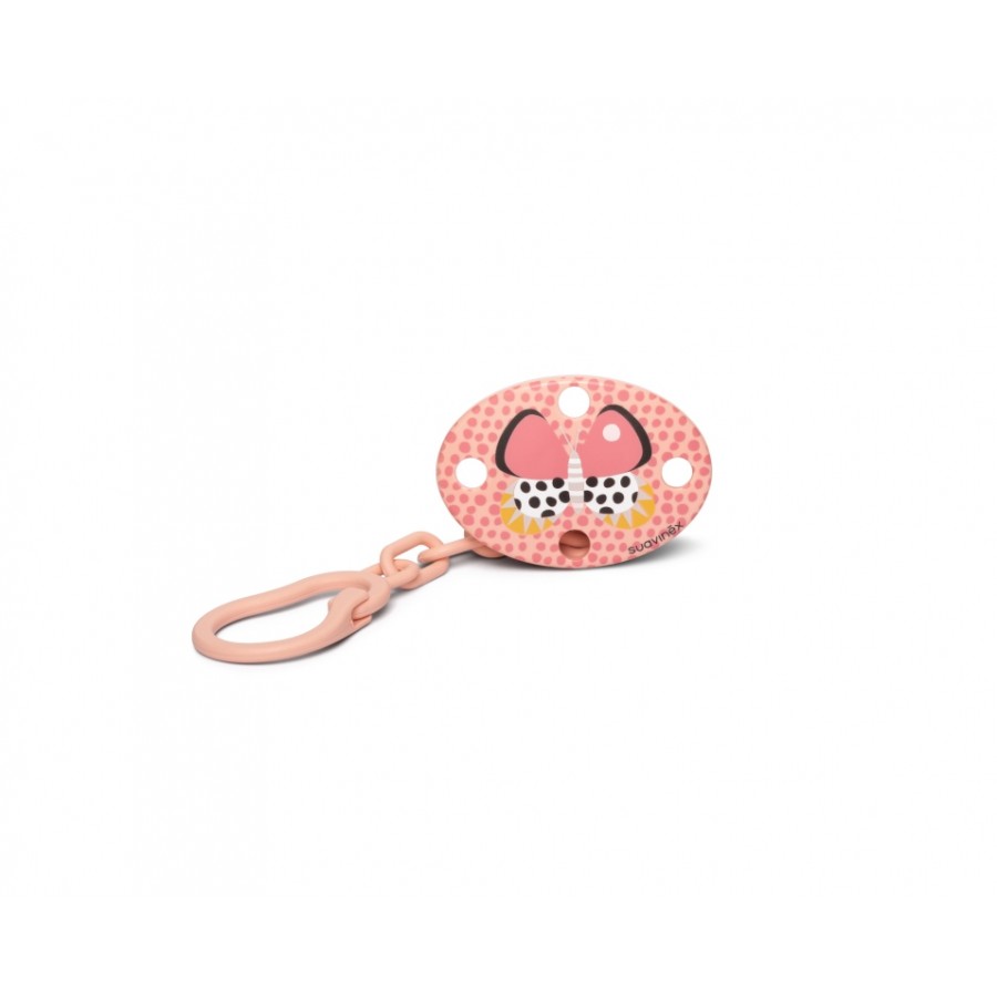 Овальная клипса Suavinex, которая позволяет крепить пустышку к одежде ребенка, предотвращая падение на пол и загрязнения или потере.