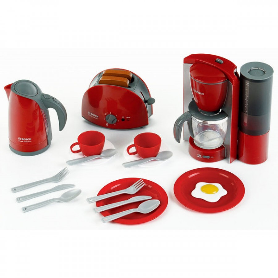 Набор для завтрака Klein Bosch состоит из тостера, чайника и кофеварки, посуды и жареного яйца. Для детей от 3 лет.